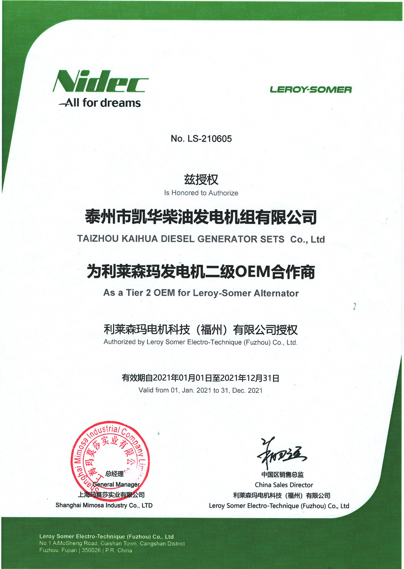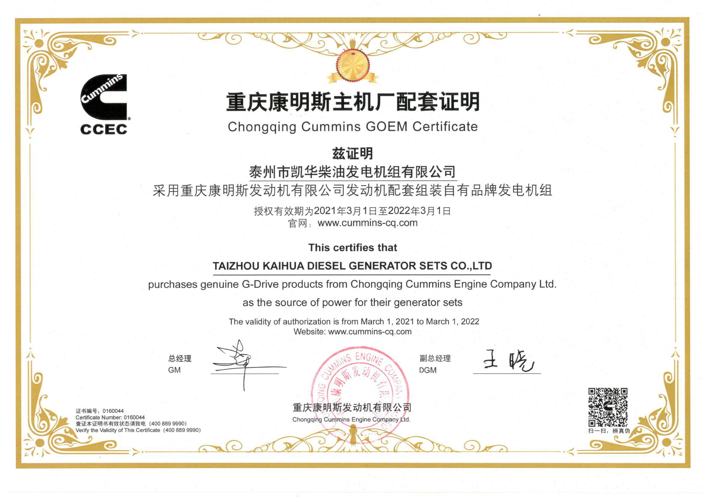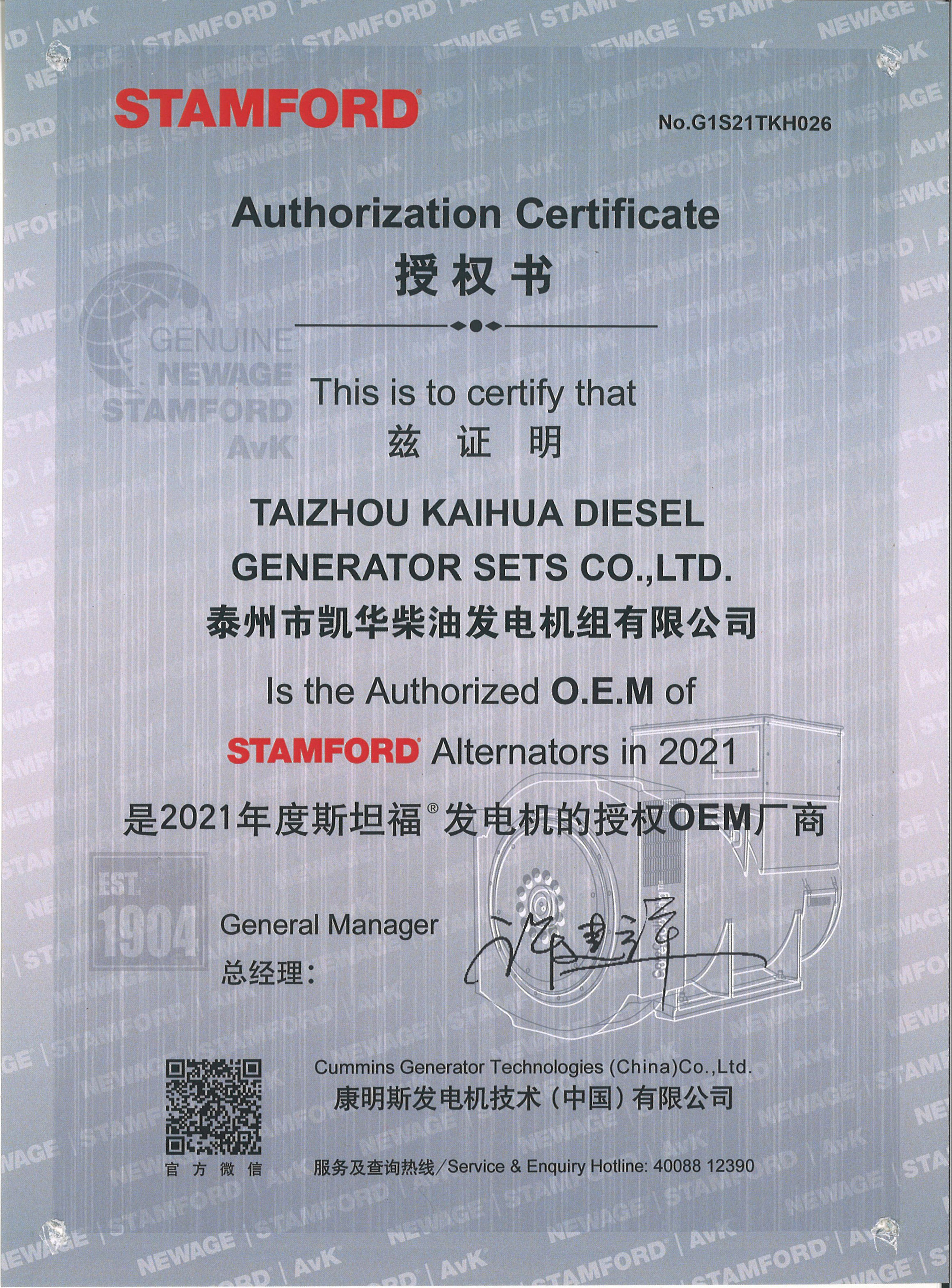 泰州市凱華柴油發電機組有限公司創建于2003年,是一家集柴油發電機組燃氣發電機組的研發、生產、銷售為一體的高新技術民營企業,公司座落于“漢唐古郡,淮海名區”,具有“鳳凰城”美稱的祥泰之州——江蘇省泰州市,地處中國經濟最發達的長三角經濟圈,水陸空立體交通,地理位置十分優越。公司目前注冊資本金11800萬元人民幣,生產基地占地六十畝,現有各類高素質員工一百多名,專業技術人員達46人,其中高級技術人員16人,年銷售額近6億元。 公司主營產品:3~3000KW陸用柴油發電機組,15~600KW移動拖車電站,12~1000KW船用應急柴油發電機組,各種靜音型、中高壓、多機并聯、燃氣等特種機組以及進口系列柴油發電機組,可滿足不同客戶的一切電力需求,還可滿足用戶不同電壓、不同頻率的要求。凱華公司是康明斯品牌的授權代理商,專業生產供應康明斯柴油發電機組。